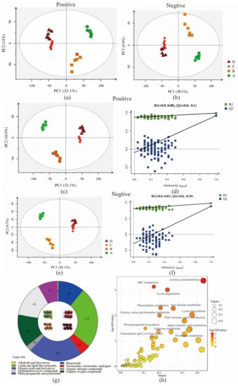 Principal component analysis (PCA) of peak areas detected in four groups of coffee samples in positive and negative ion models (a,b) (four maturity stages: A (●), B (■), C (◆), D (▲)). Partial least squares discriminant analysis (PLS-DA) and permutation test of peak areas in positive and negative ion models in four group samples (c–f). Classification of DEMs in four group samples (g). KEGG pathways of DEMs involved (h).
