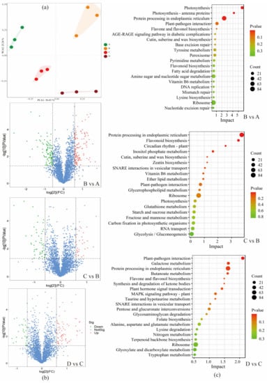 Previous research observed that the metabolites expressed generally fall behind alterations in corresponding proteins, indicating that protein expression changes are vital factors in triggering metabolic changes [22]. A TMT labeling proteomics analysis was employed to reveal the underlying molecular mechanism for the changes in nonvolatile compounds during the different maturity stages of coffee cherries. A total of 11,309 peptides were obtained (Supplementary Data S2, sheet 1), and the length of the peptides ranged mainly from 14 to 26 (Supplementary Figure S4a). The range of the peptide-spectrum match (PSM) captured per peptide segment with a mass spectrum ranged between 1 and 5 (Supplementary Figure S4b), indicating that the lengths of the peptides were reasonable, with good accuracy and reliability for identifying peptides. The molecular weights of most identified proteins ranged from 10 to 100 kDa (Supplementary Figure S4c), suggesting that the proteins have a reasonable molecular weight. Furthermore, these peptides were matched with 2748 unique proteins in the samples from the four maturity stages. The proteins included beta-galactosidase (A0A6P6WN40), cysteine protease (A0A6P6W856), and aminomethyltransferase (A0A6P6U842) (Supplementary Data S2, sheet 2). The results of the PCA showed that the samples from the four maturity stages were clustered together in different clusters (Figure 3a). Furthermore, the condition of FC ≥ 1.5 and p < 0.05 were employed to select the expressed proteins (DEPs). A total of 223 (B vs. A), 81 (C vs. B), and 98 (D vs. C) DEPs were identified, including carbohydrate synthetic protease, amino acid synthetic protease, lipase, and enzymes related to the synthesis of flavonoid polyphenols (Supplementary Data S2, sheet 3–5). There were 125 (B vs. A), 34 (C vs. B), and 71 (D vs. C) proteins up-regulated and 98 (B vs. A), 47 (C vs. B), and 27 (D vs. C) proteins down-regulated (Figure 3b).