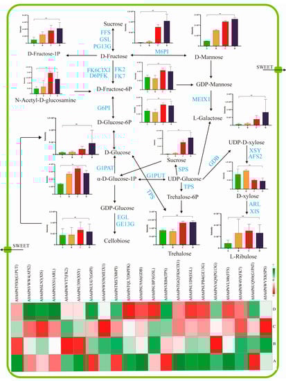 Pathway viewer of main sugar metabolism in coffee cherries. The ripening progression of protein expression from A to D is presented in four box strings. “**” represents the significant differences (p < 0.01). Putative protein families were from the Coffea Arabica L. genome database. G1PUT, UTP-glucose-1-phosphate uridylyltransferase; AFS2, α-L-arabinofuranosidase 2; XIS, xylose isomerase; ARL, aldose reductase-like; FK2, fructokinase-2; XSY, UDP-D-xylose synthase 2; G6PI, glucose-6-phosphate isomerase; MEIX1, GDP-mannose 3,5-epimerase isoform X1; M6PI, mannose-6-phosphate isomerase; D6PFK, ATP-dependent 6-phosphofructokinase; GDB, UDP-glucuronate decarboxylase; GSL, α-glucosidase-like; TPS, α,α-trehalose-phosphate synthase; FK6CIX1, fructokinase-6, chloroplastic isoform X1; EGL, endoglucanase; GE13G, glucan endo-1,3-beta-D-glucosidase; FFS, β-fructofuranosidase; FK7, fructokinase-7; G1PAT, glucose-1-phosphate adenylyltransferase; SPS, sucrose-phosphate synthase.