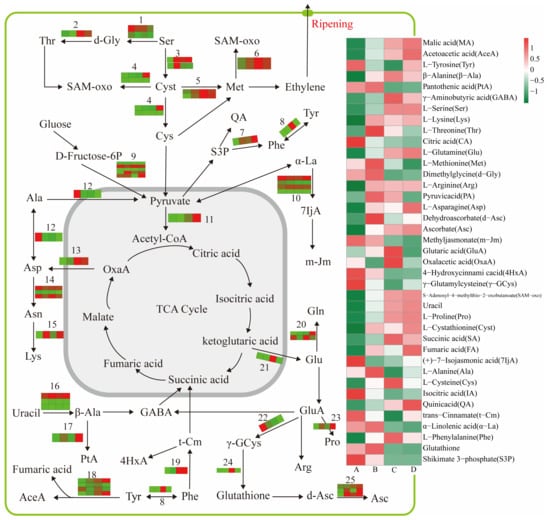 Pathway displays a subset of organic acid and amino acid metabolism proteases required in coffee cherries. The metabolites changing as ripening progresses from A to D are presented in four box strings. Heat maps, for each numbered reaction, were drawn using the TMT value. The numbered reactions were catalyzed by the following enzymes: 1, serine hydroxymethyltransferase (A0A6P6TLR0) and glutamate-glyoxylate aminotransferase 2 (A0A6P6VAJ1); 2, L-threonine aldolase 1 (A0A6P6VRS3); 3, homoserine kinase (A0A6P6VCB8) and cysteine synthase (A0A6P6WQV5); 4, L-cysteine desulfhydrase (A0A6P6VZM9) and farnesylcysteine lyase (A0A6P6T9Z7); 5, 5-methyltetrahydropteroyl triglutamate homocysteine S-methyltransferase (A0A6P6SM43); 6, S-adenosylmethionine synthase (A0A6P6SUD6); 7, shikimate dehydrogenase (A0A6P6X2E2); 8, arogenate dehydratase (A0A6P6W2X6); 9, NADP-dependent glyceraldehyde-3-phosphate dehydrogenase (A0A6P6SZ76), pyruvate phosphate dikinase (A0A6P6WRX8), phosphoglycerate mutase (A0A6P6SCM7), phosphopyruvate hydratase (A0A6P6T3Q6), and glyceraldehyde-3-phosphate dehydrogenase (A0A6P6VC84); 10, allene oxide synthase (A0A6P6UTE2), allene oxide synthase 1 (A0A6P6UPD2), allene-oxide cyclase (A0A6P6TAJ2), enoyl-CoA hydratase 2 (A0A6P6TYF9); 11, acetyl-CoA acetyltransferase (A0A6P6SED1); 12, alanine-glyoxylate transaminase (A0A6P6TM10); 13, alanine aminotransferase 2 (A0A6P6X499); 14, asparagine synthetase (A0A6P6TA86), L-asparaginase 1 (A0A6P6X331), probable L-asparaginase 3 (A0A6P6VNC7); 15, diaminopimelate decarboxylase 1 (A0A6P6VRS2); 16, dihydrothymine dehydrogenase (A0A6P6XK57), dihydropyrimidinase (A0A6P6SXN9), β-ureidopropionase (A0A6P6WDT2); 17, alanine-tRNA ligase (A0A6P6V5B4); 18, aspartate-prephenate aminotransferase (A0A6P6TCB7), tyrosine aminotransferase (A0A6P6S801), histidinol-phosphate aminotransferase (A0A6P6VSK7), fumarylacetoacetase (A0A6P6UAI6); 19, phenylalanine ammonia-lyase (A0A6P6VDX4); 20, glutamine synthetase (A0A6P6T536), glutamate synthase (A0A6P6W7J9), 21, glutamate dehydrogenase (A0A6P6SVM6); 22, γ-glutamylcyclotransferase family protein (A0A6P6UG48); 23, acetylglutamate kinase (A0A6P6TDN5); 24, glutathione synthetase (A0A6P6W069); 25, L-ascorbate peroxidase 2 (A0A6P6W0Y9), L-ascorbate peroxidase 3 (A0A6P6VST3), L-ascorbate peroxidase 6 (A0A6P6UR23).