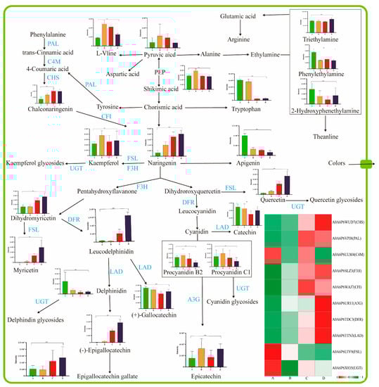 Flavonoids, especially flavonols, contribute tremendously to the astringent taste, color, and aroma formation of fruits. The phenylpropanoid and flavonoid biosynthesis pathways were principally for the biosynthesis of flavonoids [18,39]. During fruit ripening, there was a dramatic change in flavonoid composition and content, which was associated with the transformation of fruit pigmentation and flavor [40]. In this study, 10 DEPs were annotated as crucial enzymes involved in the biosynthesis of phenylpropanoids and flavonoids. These levels of enzymes were upregulated besides trans-cinnamate 4-monooxygenase (A0A6P6ULM4, C4M), flavonol synthase-like (A0A6P6UIY9, FSL), and flavanol 3-O-glucosyltransferase (A0A6P6X835, UGT) during Arabica coffee cherry ripening (Figure 6). As the first rate-limiting enzyme in the flavanol biosynthesis pathway, phenylalanine ammonia-lyase directly catalyzes the degradation of phenylalanine to trans-cinnamic acid [18]. Phenylalanine ammonia-lyase (A0A6P6VPJ8, PAL) and phenylalanine were upregulated, and trans-cinnamic acid was downregulated. This result indicated that trans-cinnamic acid was the substrate that could synthesize chalcone and naringenin by combining with trans-cinnamate 4-monooxygenase (A0A6P6ULM4, C4M), chalcone synthase (A0A6P6WUD7, CHS), and chalcone-flavanone isomerase family protein (A0A6P6WAJ7, CFI) in the phenylpropanoids pathway. In addition, the content of naringenin and chalconaringenin continuously increased from stages A to D (Figure 5 and Figure 6). These results further confirmed the above inference. The naringenin further decomposed and was involved in the synthesis of other flavonoids in the flavonoids biosynthesis pathway. Considering the nutrition and the astringent taste of flavonoids, maturity stage C could be considered a suitable harvest stage when flavor precursors were prepared. In addition, glycosidic compounds were also vital in green coffee beans because the aglycones could be released during the roasting process to enrich the aroma profile [41]. Cyanidin glycosides (n = 5), delphinidin glucosides (n = 2), kaempferol glycosides (n = 5), and quercetin glycosides (n = 2) were detected in this study. These glycosides exhibited various expression trends during ripening, mainly quercetin 3-O-glucoside, which possessed the highest ionic peak intensity at all four stages (Figure 6 and Supplementary Data S2, sheet 2).