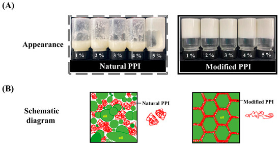 (A) Appearance of HIPEs stabilized by natural PPI and modified PPI at different concentrations (1–5 wt%). (B) Mechanism schematic diagram of HIPEs stabilized by natural PPI and modified PPI.