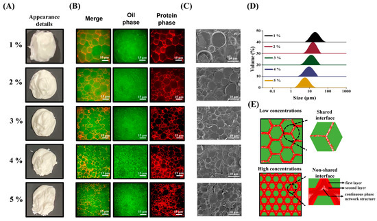 As shown in Figure 1A, 1–4 wt% natural PPI-stabilized HIPEs undergo drastic demulsification during shearing. This phenomenon was improved when the concentration increased to 5 wt%, but it showed high flow behavior and phase separation also occurred. However, the HIPEs which were stabilized by MPPI showed a gel-like appearance with good self-supporting properties and no phase separation, indicating that it had the ability to stabilize HIPE. The possible explanation for this phenomenon was that the structure of natural PPI was highly ordered, had a certain rigidity, and presented an agglomeration state, which meant it could not be adsorbed at the interface [4]. As depicted in Figure 1A, the natural PPI aggregates were scattered in the continuous phase and could not play the role of stabilizing the oil droplets. A large number of irregularly shaped oil droplets were free or floating in the system and could not be arranged in order. Under the action of external force, the system would undergo severe coalescence and demulsification. However, the hydrophobic groups and polar sites of the MPPI were exposed and the α-helical content was reduced, thus improving the solubility and emulsification [4]. MPPI with flexible structure could effectively expand and rearrange at the oil–water interface during the shearing process to tightly coat oil droplets and form a compact elastic interface film [4]. Thus, HIPEs with the typical hexagonal oil drop structure of mutual extrusion and orderly arrangement were formed [1,20], as shown in Figure 1A. In order to evaluate the effect of MPPI concentration changes on the interfacial behavior and network structure of HIPEs in more detail, and to reveal the dynamic emulsification process and stabilization mechanism accordingly, the appearance and microstructure were characterized.