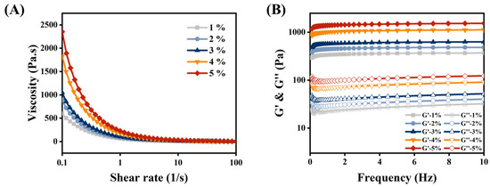 Rheological behavior was measured using a rheometer (DHR-2, Crawley, UK) equipped with a 40 mm-diameter parallel plate. The apparent viscosities were measured at the shear rate of 0.1–100 s−1. We have selected a more suitable 1% strain in the linear viscoelastic region (LVR). The storage modulus G′ and loss modulus G′′ were obtained through frequency sweeps (0.1–10 Hz frequency and 1% strain). In order to evaluate the thermal stability of the HIPEs, the G′ and G′′ were obtained (1 Hz frequency and 1% strain) as the temperature sweep range from 25 °C to 80 °C at a temperature ramp of 5 °C/min, and then maintained at 80 °C for 30 min before being cooled back to 25 °C in the same manner [16].