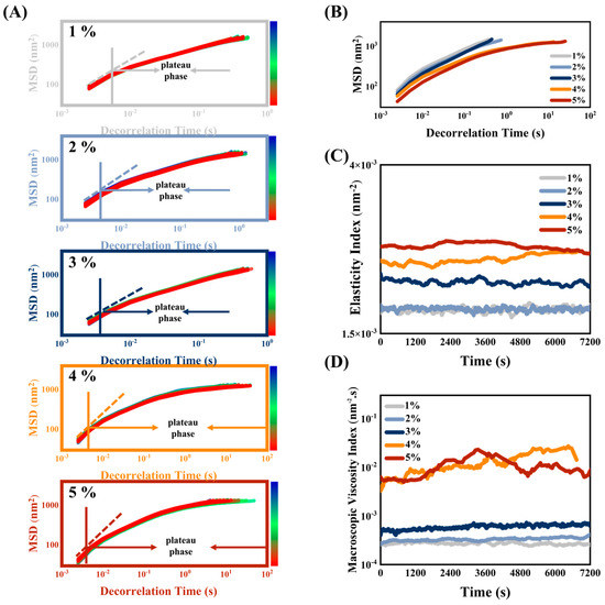 If the MSD shows a straight line over time, the sample is a free-moving Newtonian fluid. If the MSD changes with time as a characteristic curve with a plateau region, the sample is a non-Newtonian fluid that cannot move freely (viscoelastic characteristic) [17]. The MSD curves of HIPEs which had been stabilized by MPPI (1–5 wt%) are shown in Figure 4A, all showing viscoelastic characteristics. The initial MSD linear region was related to the viscosity of the solvent. [22]. Then, the droplets were trapped in a “cage mesh” composed of the viscoelastic material microstructure, and the slope of the MSD curve began to decrease into a plateau phase. This stage was used to discuss the elastic behavior of HIPEs by characterizing the structural features of the interfacial film that wraps the droplets [32,33]. The elasticity ondex (EI) corresponds to the inverse of the height of the MSD platform, which was the inverse of the distance required for a droplet to touch the “cage mesh” [18]. A lower MSD plateau height represents a smaller size of the “cage mesh” or thicker and denser HIPEs, which means less space for the droplet to move freely, indicating higher elasticity of HIPE. As shown in Figure 4B,C, with the increase in MPPI concentration, the MSD platform height decreased and EI increased, indicating that a double-layer elastic interface protein film was gradually formed, and a sufficient amount of unadsorbed proteins in the continuous phase were intertwined to form a dense 3D network that prevents the droplets from merging or deforming, thus endowing HIPEs with high elasticity. With time, the droplets escape from the “cage net” and the MSD curve rises linearly again. Interestingly, the plateau phase of HIPEs stabilized at 4 wt% and 5 wt% MPPI seems to be sustained, indicating that the movement of droplets in the system was very slow, which in turn implies the formation of highly stable HIPEs. The MVI, which is the inverse of the slope of the MSD curve after the plateau phase, quantifies the macroscopic viscosity at zero shear and the velocity of the droplet [34]. The lower the slope is, the slower the droplet motion will be, and these phenomena correspond, physically, to the higher macroscopic viscosity of HIPEs. The same trend was observed for MVI and EI in Figure 4D. As MPPI concentration increased, droplet size decreased and droplet-to-droplet packing was more tightly packed, resulting in the formation of highly stable viscoelastic HIPEs that were resistant of the deformation network system, which facilitates referencing in 3D printing. The EI and MVI of HIPEs were consistent with the results obtained for G′ (Figure 3B) and the apparent viscosity (Figure 3A) in macrorheology, respectively. In addition, the curves of EI and MVI values for both 4 wt% and 5 wt% MPPI intersected throughout the scan, which indicates that their states are similar.