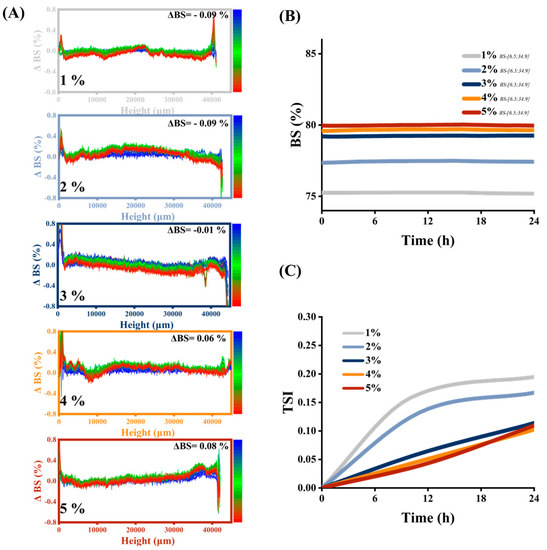 Within 24 h, the sample was repeatedly scanned from bottom to top, and data of backscattered light and transmitted light (i.e., BS and TSI) were collected to obtain a map characterizing the stability of the sample [32]. According to the highly concentrated characteristics of the prepared HIPEs, BS was selected to analyze and characterize the homogeneity, droplet size, and concentration of the system, thereby judging the stability of the system [35].