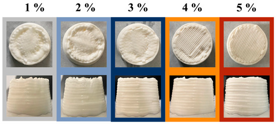 As illustrated in Figure 6, cylinders printed with HIPEs stabilized by 1–2 wt% MPPI showed poor shape fidelity, with an obvious collapse at the top, trapezoidal sides, sagging structures, obvious layer fusion, and even faults. As the protein concentration increased, the degree of collapse decreased, and the stacked layers were more easily distinguished, but there were still some minor defects. The 5 wt% group shape had high definition and high resolution, the collapse largely disappeared, the surface was smooth, and the structure a certain degree of self-supporting ability. The actual printed shape was close to the modeled shape, and the details were perfect. This change was associated with an improvement in its rheological behavior, as rheology was a bridge between edible inks and their 3D printability [35].