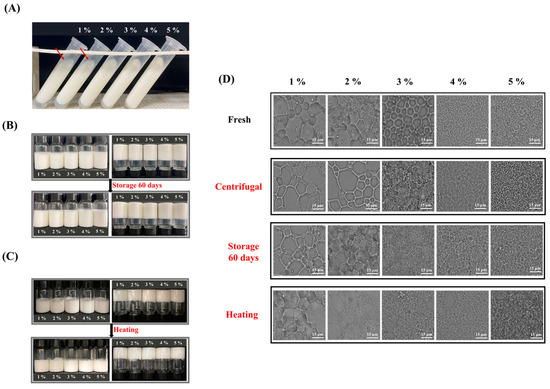 Appearance of HIPEs stabilized by 1–5 wt% MPPI after (A) centrifugation, (B) storage, and (C) heat treatment. (D) Optical microscope of HIPEs stabilized by 1–5 wt% MPPI before and after centrifugation, storage, and heat treatment.