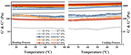 Thermal stability may affect the application of HIPEs in food processing, we consequently investigated the effect of heating on the appearance, microstructure, and rheological properties of HIPEs. The appearance of the HIPEs remained stable after heating, with some tiny pores, which were caused by the gas escaping because of heating (Figure 7C). Droplet size and microstructure did not change significantly in Figure 7D. The response of G′ and G″ to temperature change at 1% strain and frequency of 1 Hz are shown in Figure 8. The G’ of HIPEs stabilized by various MPPI concentrations remained stable during heating, indicating its excellent thermal stability. The G′ of all HIPEs increased significantly during cooling, owing both to the formation of aggregates after denaturation and the unfolding of MPPI at high temperature, which supported the network structure and improved the mechanical strength [39]. Similar phenomena had also been observed in studies of other material-stabilized HIPEs such as gliadin [26] and gelatin [19].