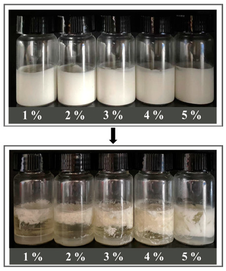 As shown in Figure 9, HIPEs stabilized by MPPI were completely demulsified after one freeze–thaw cycle, demonstrating their poor freeze–thaw stability. First, a large number of ice crystals formed during the freezing pierced the interfacial film, resulting in severe oil leaching after thawing [16]. Furthermore, the droplets were forced to aggregate in the unfrozen aqueous phase, causing the droplets to coalesce [19]. According to the experiments in the work of Xu et al. [40], HIPEs stabilized by rapeseed protein isolate were also strongly demulsified after a single freeze–thaw cycle. Although demulsification occurred in all HIPEs, the degree of phase separation appeared to decrease as the MPPI concentration increased. The thicker interfacial film and dense network formed at higher MPPI concentrations slightly inhibited droplet coalescence and piercing behavior.