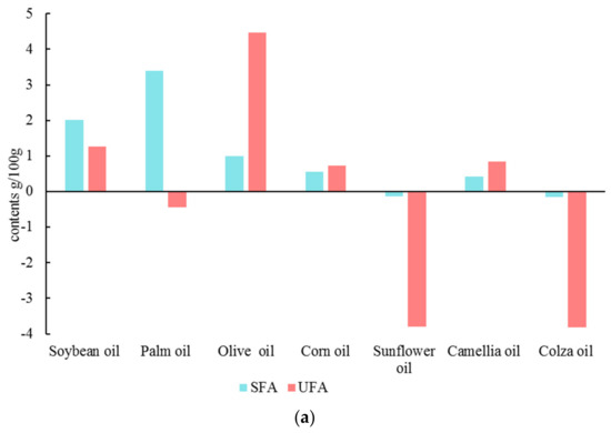 The fried oils whose contents of SFA increased after frying included soybean oil, palm oil, olive oil, corn oil, and camellia oil, while sunflower oil and colza oil decreased. For the UFA, the contents of soybean oil, olive oil, corn oil, and camellia oil were increased after frying, and the palm oil, sunflower oil, and colza oil were clearly decreased. Specifically, the fried olive oil had the most increase in the UFA content. For the MUFA and PUFA, the contents of MUFA in soybean oil, olive oil, corn oil, and camellia oil were increased after frying. Moreover, the contents of PUFA slightly increased, including soybean oil, palm oil, olive oil, corn oil, and camellia oil. Conversely, MUFA and PUFA decreased for sunflower oil and colza oil. Significantly, the reason the total amount of UFA of the fried palm oil decreased was that the decrease of MUFA was significantly higher than the increase of PUFA after frying.