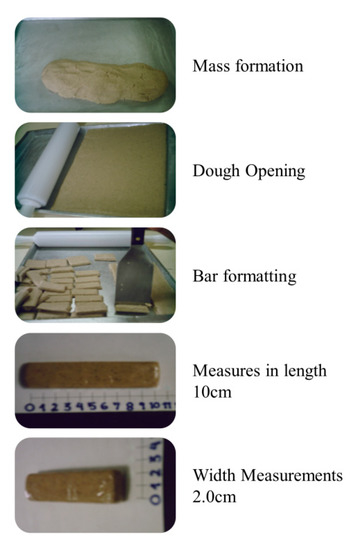 The formulations were made from the mixture of these ingredients and their respective concentrations, transferred to flat surfaces, unrolled and cut into bars, measuring approximately 10 × 2 × 1 cm3, weighing 30 g each. The bars were individually wrapped in flexible film (PVC Strtch Film 280 mm × 300 mm), vacuum packed, covered with aluminum foil and stored at room temperature (≈25 °C) (Figure 1).