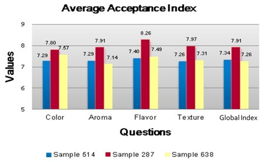 The samples were presented monadic and casualizada manner, disposable plates coded with three-digit numerals. The acceptance index (AI) and purchase intention (PI) were obtained using Equation (2), where M is the average of the grades obtained and X the maximum score (9) for the acceptability test and 5 for the buy intention.