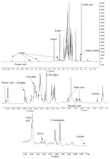 1H-NMR spectrum of a Traditional Balsamic Binegar of Modena. EtOAc, ethyl acetate; ffur, fructofuranose; fpyr, fructopyranose; gpyr, glucopyranose; 5-HMF, 5-hydroxymethylfurfural.