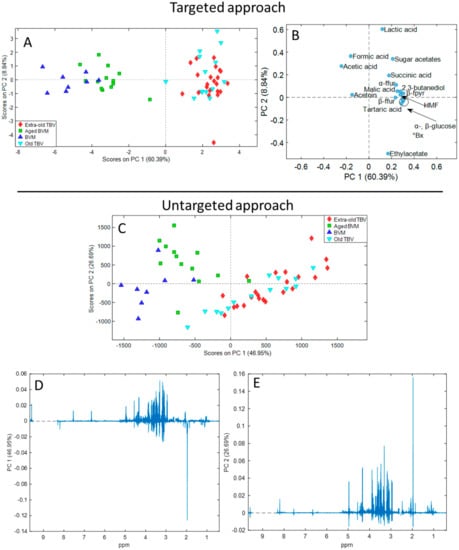 Score (A,C) and loading (B,D,E) plots of the principal component analyses performed on targeted (quantitative results from qNMR analysis) and untargeted (spectral points of NMR spectra) datasets.