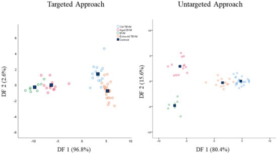 Overall, sensitivity was higher than 87.5%, while specificity was greater than 85.7%. Sensitivity is defined as the capability of the model to correctly classify samples belonging to the class; besides, specificity expresses the capability of the model to reject samples not belonging to the class. The samples correctly classified in the targeted approach were 91.2% and 89.5% in calibration and cross-validation, respectively, whereas in the untargeted approach were 98.2% and 94.7%. Thus, both models showed excellent classification capabilities. Due to their close chemical composition, the unclassified samples were mainly represented by old and extra-old TBVM. Additionally, the targeted LDA model did not discriminate one sample of aged BVM from the not-aged BVM group. For the latter reason, the sensitivity and specificity percentages of the targeted LDA model were slightly lower than the untargeted model. The greater strength of the untargeted LDA model was also noticed from the score plots reported in Figure 3, where BVM and aged BVM were clearly clustered and separated into two different groups. Both targeted and untargeted models extracted two discriminant functions (DF) explaining 99.4% and 96% of the total variance, respectively.