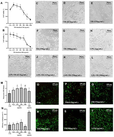 Effect of TB on RAW264.7 macrophages. (A,B) Cell viabilities (24 h and 48 h). (C–H) Effect of TB on the morphology of RAW264.7 cells (×200). (I–L) Effect of TB on the LPS-induced morphology of RAW264.7 cells (×200). (M) Pinocytosis effect of TB on taking neutral red. (N) Phagocytosis effect of TB on taking FITC-labeled E. coli. (O–T) Fluorescence microscopic images of phagocytosis effect of TB (×100). The statistically significant differences are marked with different letters (a, b, c, d, e).