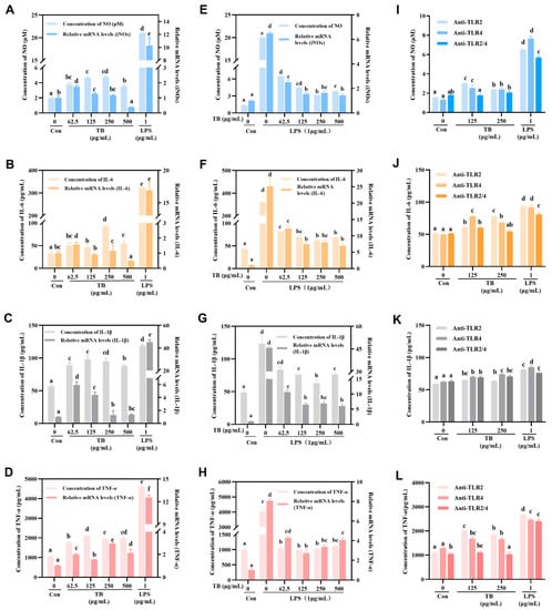 Effects of TB on production of NO and cytokines (IL-6, IL-1β, and TNF-α). (A–D) The content and mRNA expression of RAW264.7 cells from secreting NO and cytokines following TB treatment. (E–H) The content and mRNA expression of LPS-induced RAW264.7 cells from secreting NO and cytokines following TB treatment. (I–L) The content of RAW264.7 cells from secreting NO and cytokines following anti-TLR2, anti-TLR4, or anti-TLR2/4 treatment. The statistically significant differences are marked with different letters (a, b, c, d, e, f).