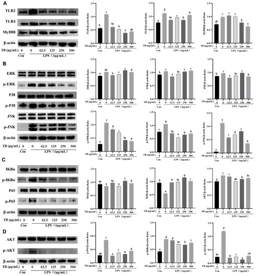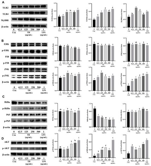 Western blot of anti-inflammatory effects of TB on TLR2/4-mediated pathway in RAW264.7 cells. (A) The expressions of TLR2/4 and MyD88. (B) The expressions of key proteins of the NF-κB signaling pathway. (C) The expressions of key proteins of the MAPK signaling pathway. (D) The expressions of key proteins of the PI3K–AKT signaling pathway. β-actin was used as a loading control. The statistically significant differences are marked with different letters (a, b, c, d, e, f).