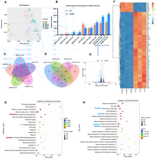 Results of cellular transcriptomics analysis. Data were extracted from RNA-seq results (three replicates per group). (A) PCA analysis of all groups. (B) Differentially expressed genes in different groups. (C) Venn analysis comparing genes in TB treatment groups vs. Con-group. (D) Venn analysis comparing genes in TB treatment groups vs. LPS group. (E) Volcano plots of RNA-seq data for 250 μg/mL TB group vs. LPS group. (F) Heat map depicting the significantly differentially expressed genes for 250 μg/mL TB group vs. LPS group. (G) KEGG pathway enrichment based on differential genes in 250 μg/mL TB group and LPS groups (red arrow: NF-κB and toll-like receptor signaling pathways). (H) GO enrichment based on differential genes in 250 μg/mL TB group and LPS groups (blue arrow: functions related to inflammation and immunity).