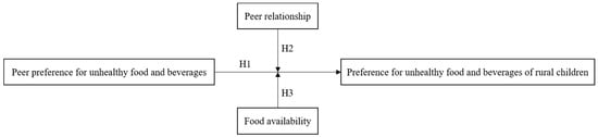 Children are motivated to voluntarily follow the social norms of peer groups, so they are likely to adopt eating attitudes and preferences similar to their peers. This behavior is positively correlated with unhealthy eating preferences [48]. Research on unhealthy eating behavior of rural children has found that there was a relation between peers and rural children eating unhealthy food, especially snacks with high saturated fat content [49]. Some experiments have also confirmed that the intake of unhealthy snacks by rural children in the presence of their peers is higher than that of their mothers [50]. Therefore, this paper proposes the following hypothesis: