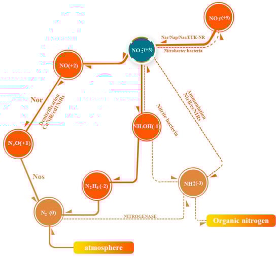 Nitrite is one of the nitrogen cycle intermediates on Earth [10]. Nitrogen in nature is mainly present as NH4+, as the inert N2, the lowest oxidized state, and as NO3−, the highest oxidized state. The transition between NO3− and NO2−, NH4+, and N2 in the biogeochemical cycle constitutes the balance of nitrogen synthesis and degradation through nitrate and denitrification bacteria (Figure 1).