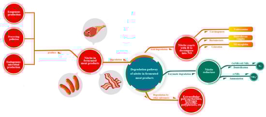 Exogenous manufacture, contamination during processing, and endogenous microbial synthesis are the main sources of nitrite in fermented meat products. In addition, a small amount of nitrite is produced by contamination during rearing and endogenous microbial production. Acids, enzymes, and non-acid and non-enzyme compounds in bacteria can degrade nitrite in fermented meat products (Figure 2).