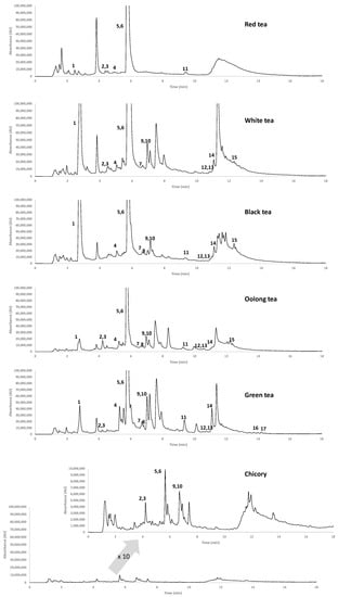 HPLC-UV chromatograms recorded at 280 nm for selected samples for each tea variety and a chicory extract. Peak identification: 1, gallic acid; 2, protocatechuic acid; 3, quercetin; 4, (−)-epigallocatechin; 5, (+)-catechin; 6, 4-hydroxybenzoic acid; 7, vanillic acid; 8, caffeic acid; 9, syringic acid; 10, (−)-epicatechin; 11, p-coumaric acid; 12, ferulic acid; 13, sinapic acid; 14, rutin; 15, myrcetin; 16, apigenin; 17, kaempferol.
