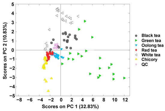 The signal peak areas of the 17 targeted flavonoid and phenolic acid compounds at the three monitored acquisition wavelengths in all the analyzed tea and chicory samples were employed to build the X-data matrix for chemometrics. The resulting data matrix had a dimension of 133 × 30 (tea/chicory/QC samples × detected polyphenolic peak areas at three wavelengths). It should be commented that some compounds are not detected at some of the registered acquisition wavelengths. This matrix was first subjected to PCA to explore the sample distribution and evaluate data repeatability, as well as the robustness from the QCs behavior.