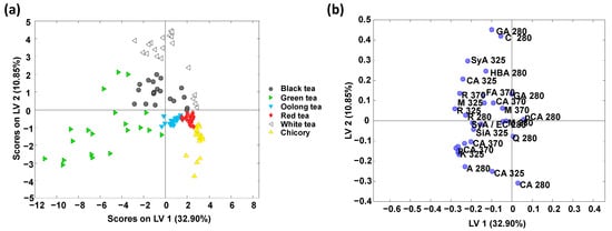 The X-data matrix (see Section 3.2) without considering the QCs (matrix dimension 120 × 30, tea/chicory samples × polyphenolic peak areas) was subjected to supervised PLS-DA for classificatory studies. In this case, a Y-data matrix including the sample classes (black, white, green, red, and oolong teas, and chicory) was employed. Figure 3 shows the obtained PLS-DA (a) score and (b) loading plots of LV1 versus LV2 when using the obtained polyphenolic profiles as sample chemical descriptors. A similar discrimination among classes to the one observed by PCA was obtained, although with a different spatial distribution of the sample groups within the plot. In any case, samples are clearly grouped according to tea variety and chicory (the studied adulterant) classes.