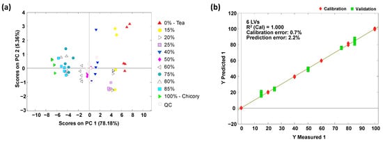 Green tea adulterated with chicory case. (a) PCA (PC1 vs. PC2) results showing the distribution of both calibration and prediction samples according to the chicory adulterant level. (b) PLS results showing the scatter plot of measured vs. predicted percentages of chicory adulterant.