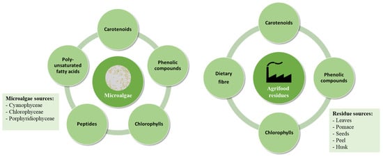 In recent years, purified extracts obtained from plants, fruits, and vegetables have been used as bioactive compounds, both lipophilic and hydrophilic. However, in recent years, the search for more sustainable foods has focused the attention on the use of alternative sources to obtain bioactive compounds. Among these natural alternatives, the use of microalgae seems to be a suitable source from which to obtain these bioactive compounds due to the fast growth, high yield, and short cultivation time of microalgae [20] (Figure 1). In addition, residues from the agrifood industry are promising sources of these compounds with biological activity. This form of residue valorisation would represent a new conceptualisation of sustainability in the food chain, moving from a linear to a circular economy and allowing the possibility of advancing the use of co-products to generate new and safe value-added products [21].