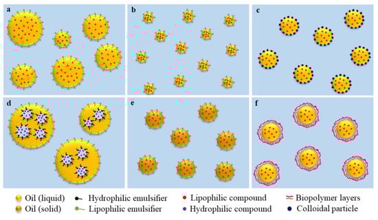 Different emulsion-based delivery systems to carry bioactive compounds. (a) Oil-in-water emulsions. (b) Oil-in-water nanoemulsions. (c) Pickering emulsions. (d) Water-in-oil-in water double emulsions. (e) Solid-lipid nanoparticles. (f) Multi-layer emulsions.