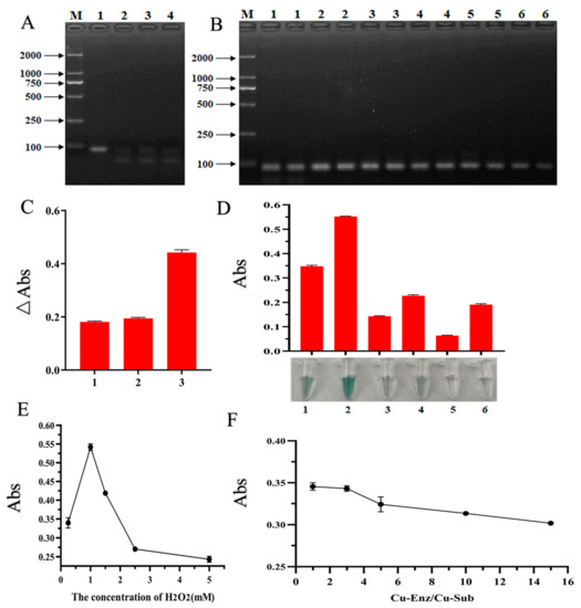 Under different conditions, the cutting efficiency of copper ions is also different. Three kinds of buffer were chosen to perform experiments, including buffer 1 (1.5 M NaCl, 50 mM HEPES, pH 7.0), buffer 2 (100 mM HEPES, pH 7.0, 0.008% (v/v) Trition X-100, and 400 mM NaCl), and buffer 3 (ultrapure water). The result is shown in Figure 2C. Under the condition of buffer 3, the change in absorbance (ΔAbs, ΔAbs = Abs0 − Abs, where Abs0 represents the absorbance in the absence of copper ions and Abs represents the absorbance in the presence of copper ions) was the biggest. Thus, buffer 3 was used in this study.