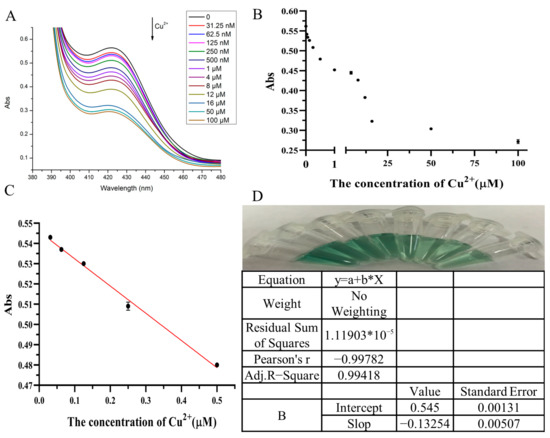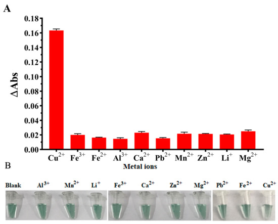 To evaluate the selectivity of the biosensor to Cu2+, different relevant metal ions with a concentration of 10 μM were used for detection, including Cu2+, Fe3+, Fe2+, Al3+, Ca2+, Pb2+, Mn2+, Zn2+, Li+, and Mg2+. In Figure 4A,B, in the presence of Cu2+, the change of absorbance (ΔAbs, ΔAbs = Abs0 − Abs, where Abs0 represents the absorbance in the absence of metal ions and Abs represents the absorbance in the presence of metal ions) gave a remarkable enhanced absorbance signal and had a noticeable weakening of the color. These results indicated that the biosensor system had good selectivity toward Cu2+. The original measurement data in Figure 4A had shown in Table S6.