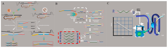 Schematic illustration of the “turn-off” biosensor for the detection of copper (II) ions based on Cu2+-dependent DNAzyme coupled with ligation-dependent probe and PCR amplification technology. (A) Signal recognition of copper ion; (B) Signal amplification; (C) Signal output.