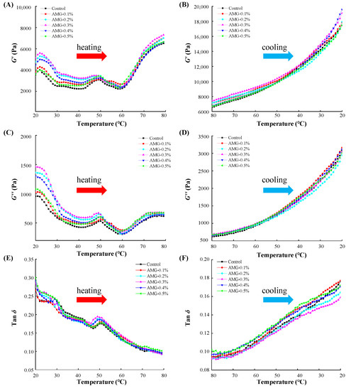 The rheological behaviour (storage modulus (G′); loss modulus (G′′); and loss tangent (tan δ)) of meat batters with or without AMG at different concentrations. (A,C,E) represent the heating treatment (from 20 °C to 80 °C). (B,D,F) represent the cooling treatment (from 80 °C to 20 °C). Control: no added AMG; AMG-0.1%: 0.1% added AMG; AMG-0.2%: 0.2% added AMG; AMG-0.3%: 0.3% added AMG; AMG-0.4%: 0.4% added AMG; and AMG-0.5%: 0.5% added AMG.