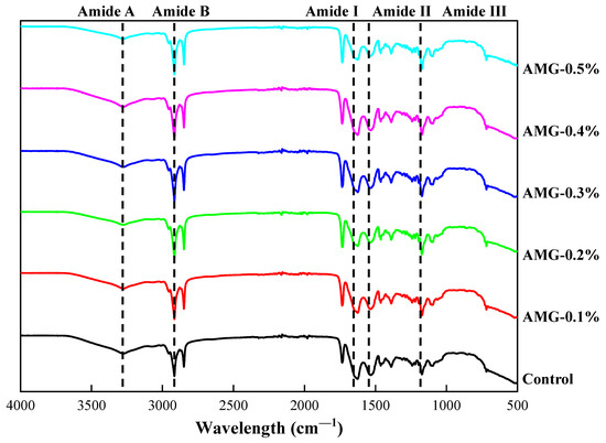 Infrared spectrogram of frankfurters with or without AMG at different concentrations. Control: no added AMG; AMG-0.1%: 0.1% added AMG; AMG-0.2%: 0.2% added AMG; AMG-0.3%: 0.3% added AMG; AMG-0.4%: 0.4% added AMG; and AMG-0.5%: 0.5% added AMG.