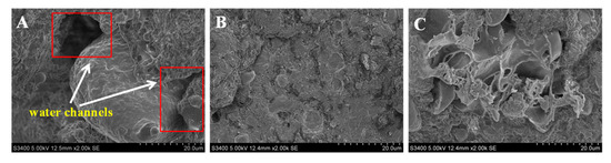 To further observe the gel network conformations of the meat proteins, the microstructure of the frankfurters was examined by SEM. As shown in Figure 3A, a loose and porous gel network structure with increasingly larger holes throughout (indicated by the white arrows in Figure 3A) was observed in the control group. This rough microstructure could not tightly trap water and fat during the heating process and could be easily broken by external forces, which explains the lower hardness, springiness, and G′ value, as well as higher cooking loss, as discussed above. Zhuang et al. reported that there were more water channels throughout the MP gel net structure which might produce a negative impact on gel interaction [50]. Moreover, based on the previous texture and dynamic rheological behaviour results, the frankfurters were improved most effectively when the AMG addition concentration reached 0.3%. Therefore, the microstructure of the AMG-0.3% group was further observed and analysed by SEM. As shown in Figure 3B, frankfurters with AMG added showed a more continuous, uniform, and compact three-dimensional gel network structure compared to the control group, which was mainly attributed to more hydrophobic interactions and ionic bonds between the meat proteins and AMG. Zhao et al. reported that regenerated cellulose (RC) could induce the formation of a more uniform and denser MP gelation network structure, which might be due to the higher viscosity of the RC [51]. Zhuang, Wang, Jiang, Chen, and Zhou also demonstrated that a more compact MP network structure was obtained with the incorporation of KGM [52]. However, compared to the AMG-0.3% group, the MP gel networks loosened and formed a filamentous shape with an increased AMG addition of 0.5% (as shown in Figure 3C). The reason for this was that the higher content of polysaccharide restricted MP aggregation, causing a weaker gel network, which was in agreement with the texture analysis results. Zhuang et al. pointed out that excess KGM induced the formation of a weaker hydrogel by hydrogen bonds and was interpenetrated with meat protein before the heating process [53].