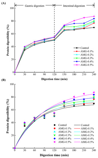 In vitro digestibility (A) and digestion kinetics (B) of meat proteins in frankfurters with or without AMG at different concentrations. Control: no added AMG; AMG-0.1%: 0.1% added AMG; AMG-0.2%: 0.2% added AMG; AMG-0.3%: 0.3% added AMG; AMG-0.4%: 0.4% added AMG; and AMG-0.5%: 0.5% added AMG.