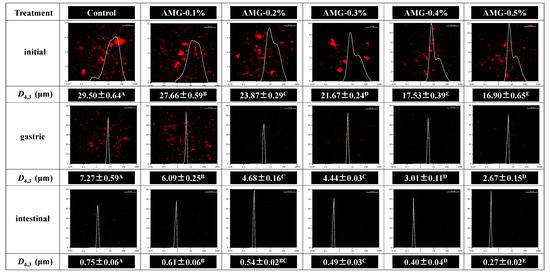 Particle size can represent the degree of protein decomposition, which is a crucial indicator to evaluate protein digestion [56]. As shown in Figure 5, the particle size of meat proteins before digestion decreased significantly with increasing concentrations of AMG (p < 0.05). This might be because the meat proteins were sufficiently unfolded due to AMG incorporation, which allowed the meat protein to be evenly dispersed in the extract solution, and thus the particle size to be reduced.