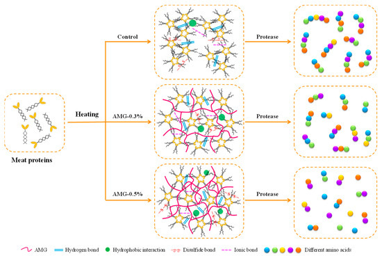 The schematic mechanism for the improvement of frankfurter quality profiles induced by AMG is presented in Figure 6. The meat proteins formed a protein gel network with more water channels throughout it after heat treatment, which caused the loss of water and fat, thus leading to a higher cooking loss of the frankfurters. For the AMG-0.3% group, AMG could be used as a splendid “filler” to fill the water channels in the meat protein gel matrix, thereby trapping more water and fat, as well as reducing the cooking loss of frankfurters. Concurrently, the meat protein gel network structure veered towards greater uniformity and density due to the filling effect of AMG, which could improve the textural and rheological characteristics of the frankfurters. However, when the AMG addition level was increased to 0.5%, although the cooking loss of the frankfurters was further reduced due to the AMG filling more water channels, the overfilling resulted in the loss of the original springiness and chewiness of the frankfurters, leading to a decrease in the textural parameters. Moreover, the molecular force results confirmed that the improvement of the frankfurter quality profiles by AMG was not only due to the physical “filling effect”, but also contributed by the interaction between polysaccharide molecules and meat proteins. Furthermore, AMG easily absorbed water and swelled, which increased the effective contact area between meat proteins and digestive enzymes, thus improving the digestibility of the meat proteins in the frankfurters.