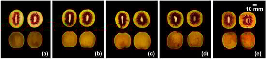 Morphological characteristics of kiwifruit “Hongshi No. 2” at different stages. Pictures (a–e) are the horizontal section and complete appearance of kiwifruits at different stages a, b, c, d, and e, respectively.
