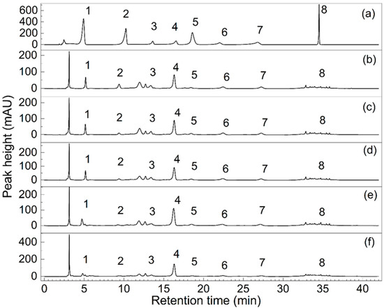 Chromatograms of phenolic standards and kiwifruit samples at different stages. (a) Represents the chromatogram of the mixed standard, and (b–f) are the chromatograms presented for the five stages: A, B, C, D, and E, respectively, where 1 is gallic acid, 2 is protocatechuic acid, 3 is procyanidin B1,4 is (+)-catechin, 5 is chlorogenic acid, 6 is procyanidin B2, 7 is (−)-epicatechin, and 8 is isoquercitrin.