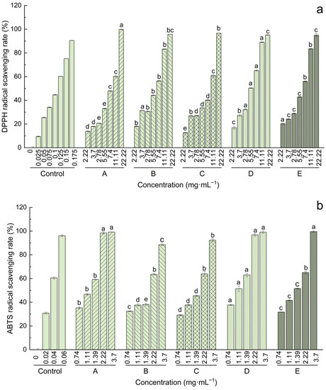 DPPH (a) and ABTS (b) free radical scavenging abilities of methanolic extracts of kiwifruit at different stages. Different letters (a–e) at the same concentration indicate significant differences in antioxidant potentials of samples during different post-softening stages.