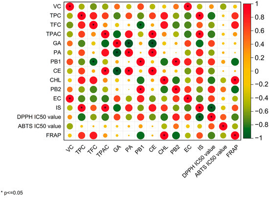 Pearson correlation matrix among Vc, phenolics, and antioxidant activity. The correlation coefficients are proportional to the circular size and color intensity. The positive correlation is displayed in orange, and negative in green. * shows significant correlation at p < 0.05.