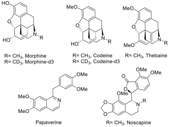 - Carlin, M.G.; Dean, J.R.; Ames, J.M. Opium alkaloids in harvested and thermally processed poppy seeds. Front. Chem. 2020, 8, 737. [Google Scholar] [CrossRef]