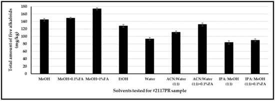 Extraction efficiency for alkaloids was investigated using the following solvents and solvent mixtures covering a broad range of polarity index values: methanol, acidified methanol (0.1% and 1% formic acid), ethanol, water, and solvent mixtures such as acetonitrile–water (1:1, v/v), acetonitrile–water (1:1, v/v) with 0.1% formic acid, IPA–methanol (1:1, v/v), and IPA–ethanol (1:1, v/v) with 0.1% formic acid (Figure 4). Poppy seeds (# 2117PR) were homogenized using a grinder. Approximately 100 mg of the seeds were weighed in duplicate, and the solvent was added. A mixture of deuterated internal standards (morphine-d3 and codeine-d3) was added to each solution; tubes were capped, placed into an ultrasonic bath for 30 min, and centrifuged at 4000 rpm for 15 min. Ultrasound-assisted extraction was carried out and optimized for the above solvents, time of extraction, and concentration of constituents in each organic solvent. Among the different solvents, the optimum extraction conditions were realized when 100 mg of poppy seeds were extracted with 10 mL of methanol containing 1% formic acid (see under the Section 2).