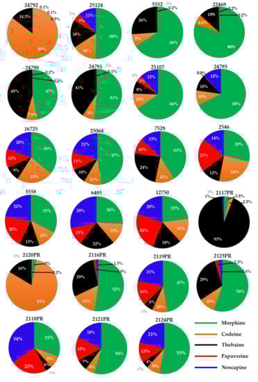 Content of alkaloids (μg/g) observed in different poppy seed samples. The area of a slice in each pie chart is proportional to the individual alkaloid’s content (μg/g).