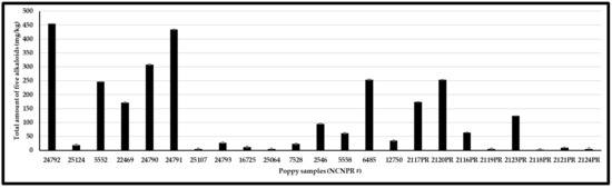 Poppy seeds are a product of the opium poppy (Papaver somniferum L.), which belongs to the Papaveraceae family. P. somniferum has been cultivated for its seeds and their recreational, analgesic, and narcotic properties since prehistoric times [1,2]. These are tiny, edible, kidney-shaped seeds harvested as a source of alkaloid compounds for the pharmaceutical industry and as a source of poppy seeds for the food industry [3]. The sap, or latex, of the poppy plant, when dried to yield opium, contains multiple alkaloids, including opiates (OAs) such as morphine, thebaine, codeine, papaverine, and narcotine [4,5]. About 218 species belong to the genus Papaver [6,7], and 170 alkaloids have been reported from this genus [8]. Among these species, only Papaver somniferum L. and Papaver setigerum DC. (a synonym of Papaver somniferum subsp. setigerum (DC.) Arcang.) [9,10,11,12] produce higher quantities of narcotic substances as their secondary metabolites. Hence, the former species has been commonly cultivated. Although the seeds may contain low levels of opiates, contamination of residual poppy latex during harvesting and processing is known to contribute to higher levels of opiates [3,4,5,13].